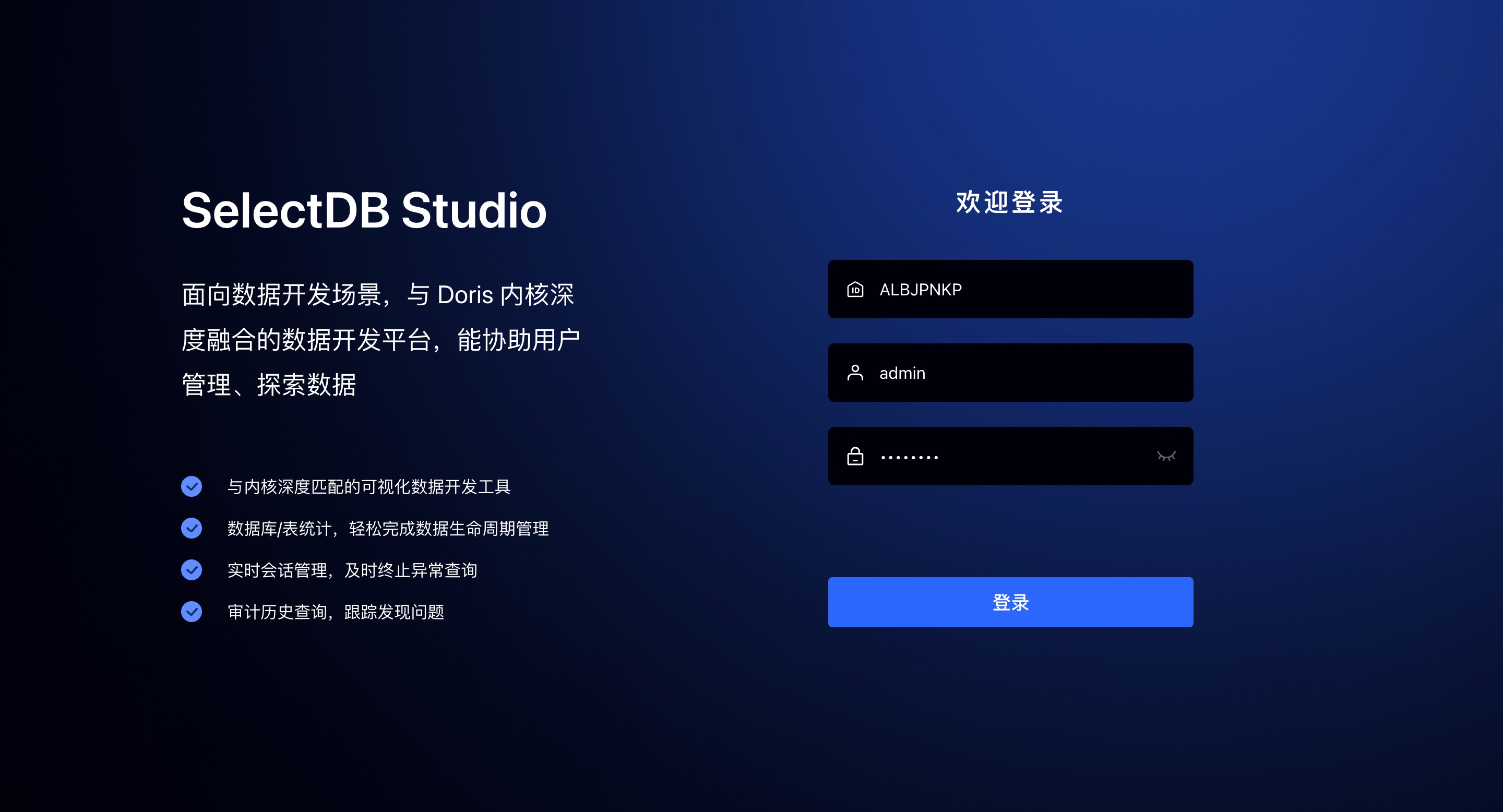 你需要在登录页面输入数据仓库的 用户名密码 以及 仓库名 。如果你是从 Manager 点击链接跳转登陆的,仓库 ID 会预先填写。