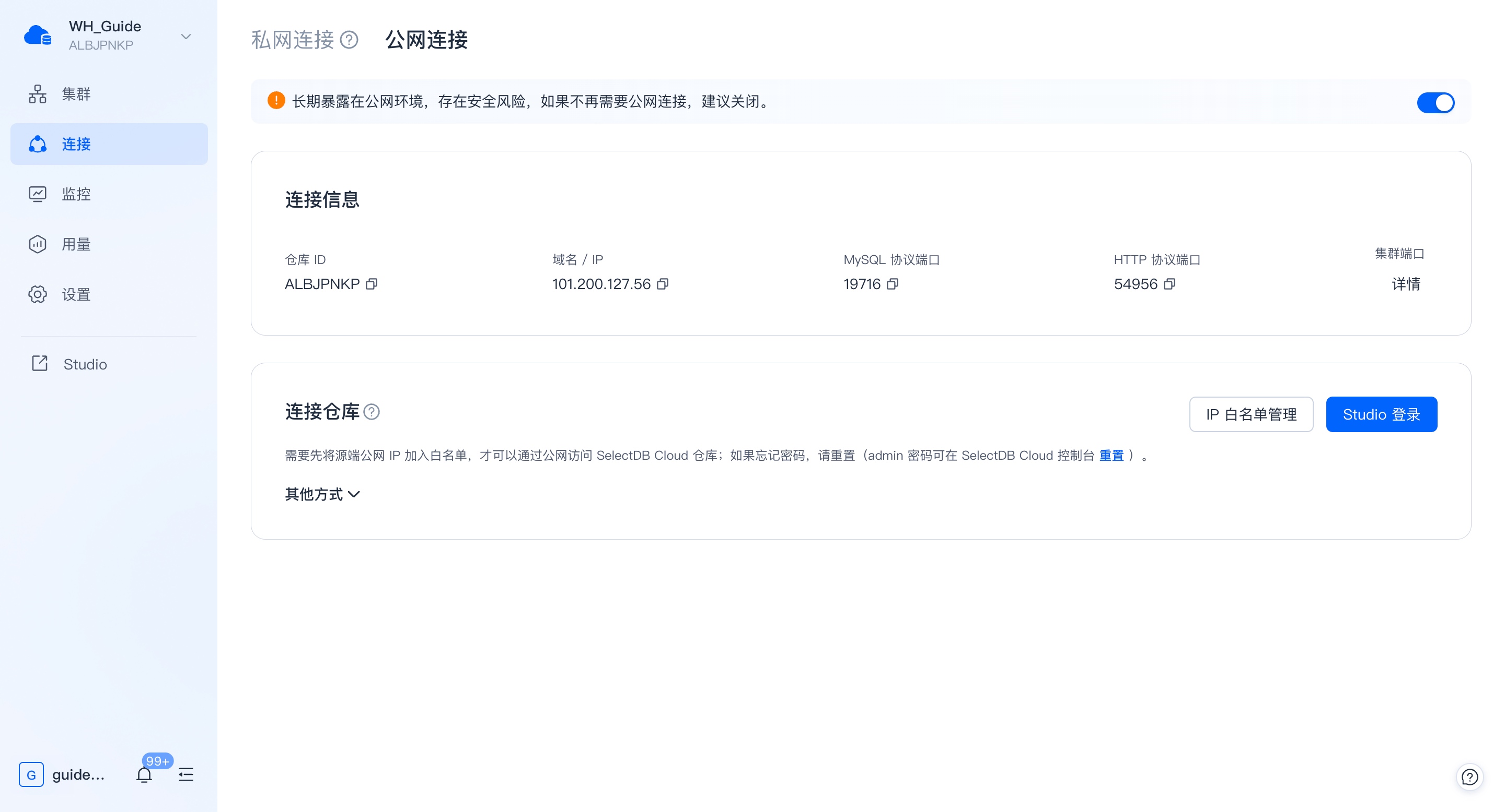 你可以在导航栏菜单中 或者在 “连接” 模块的公网或私网信息中,找到 Studio 的链接地址。或者你也可以保存 Studio 的入口地址,方便下次访问。