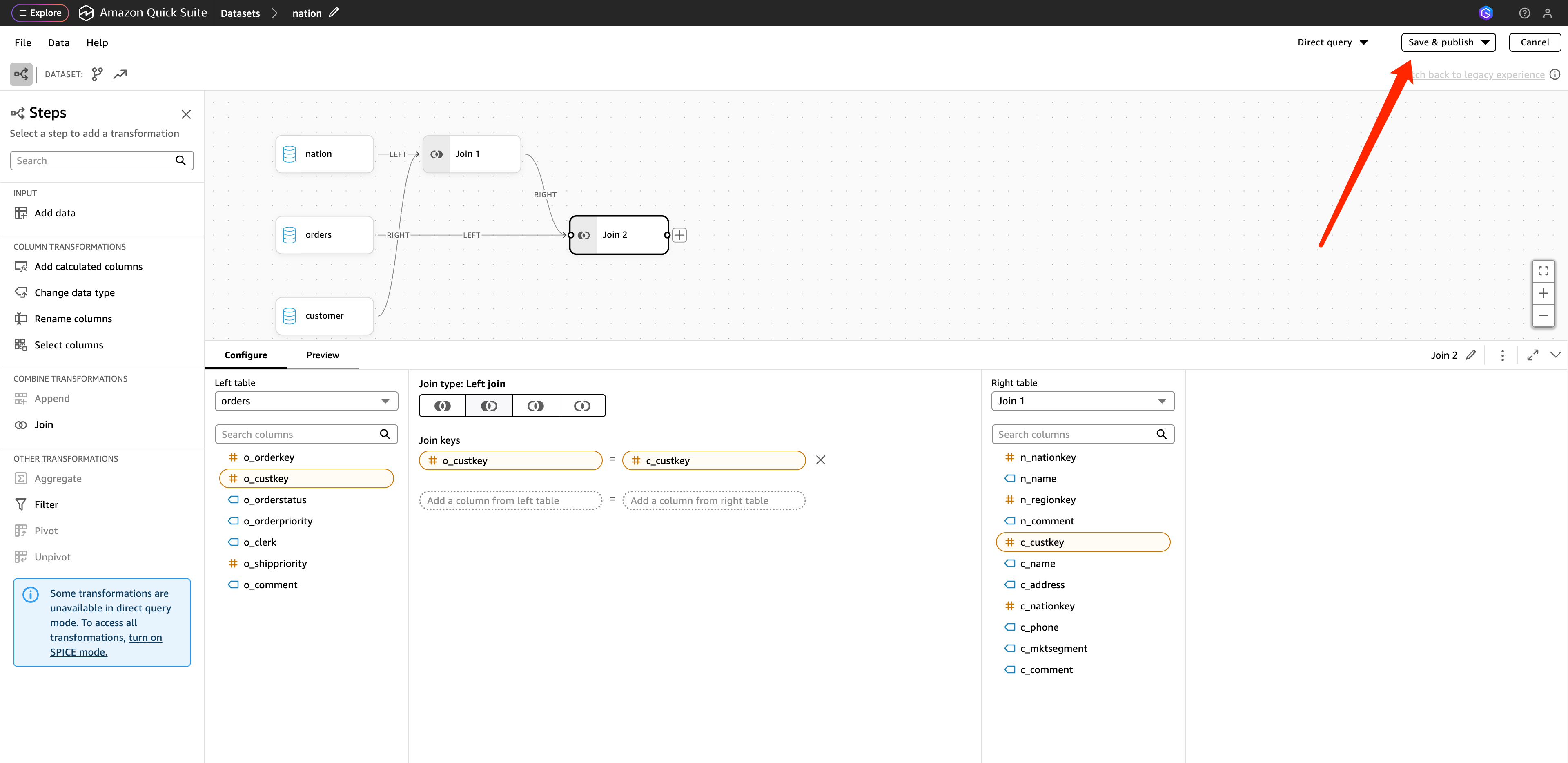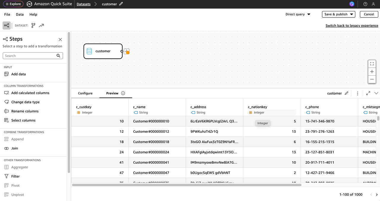 此外,通过点击 “Edit/Preview data”,您应该能够看到内部结构的表结构或调整自定义 SQL ,并且可以在此处进行 数据集的调整: