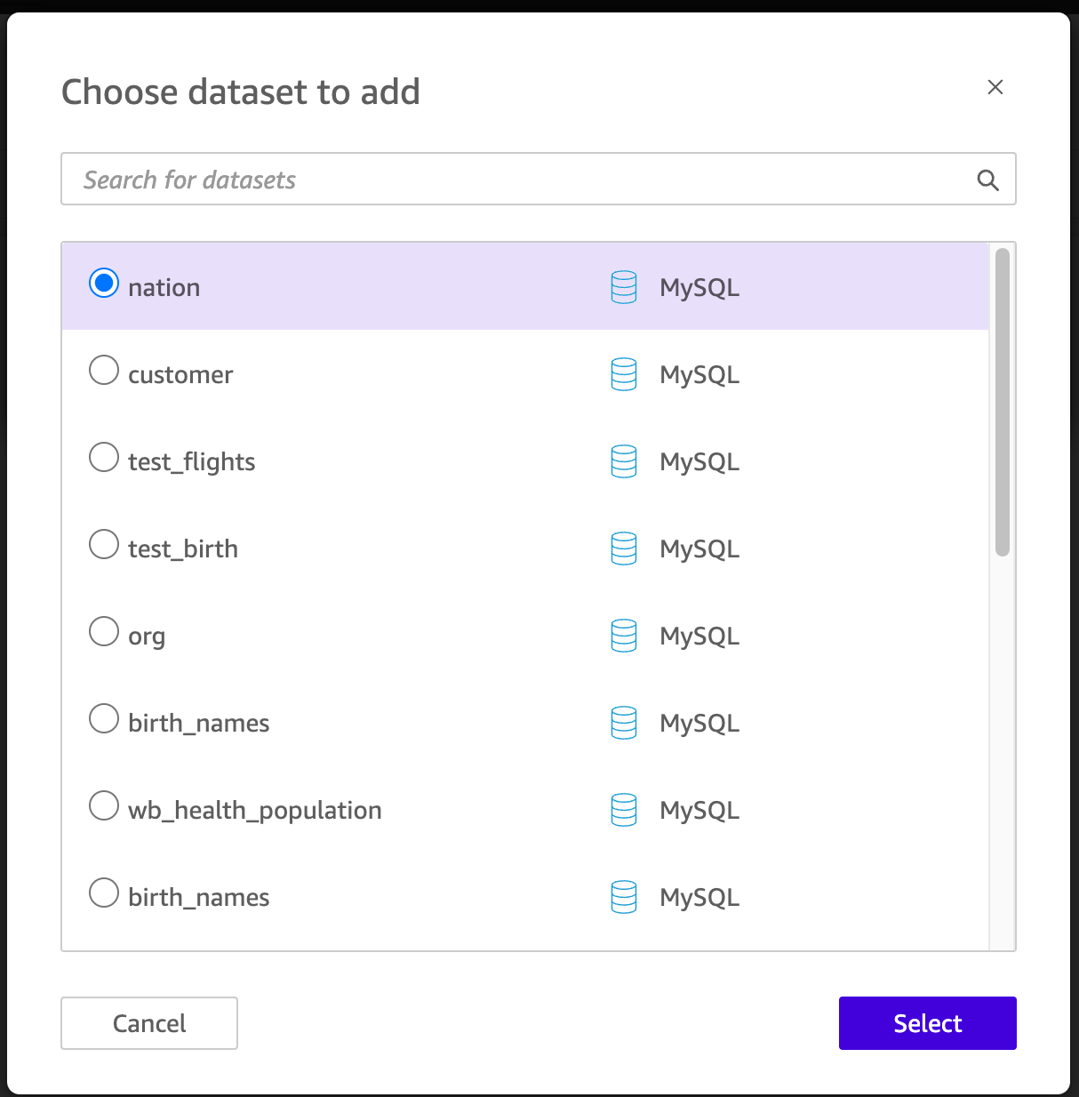 - 将所有的数据集依次勾选,点击 Select,添加入该仪表盘