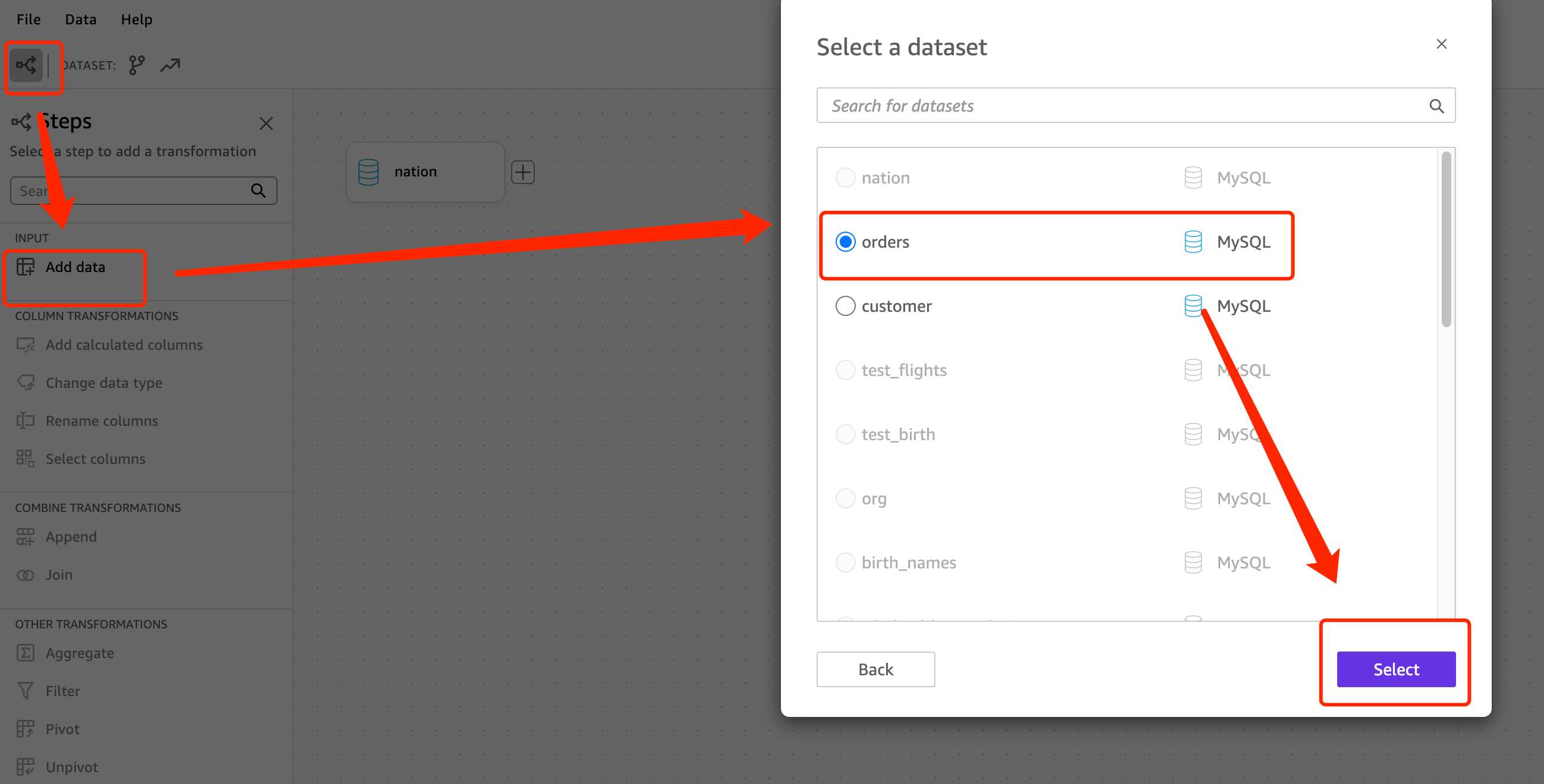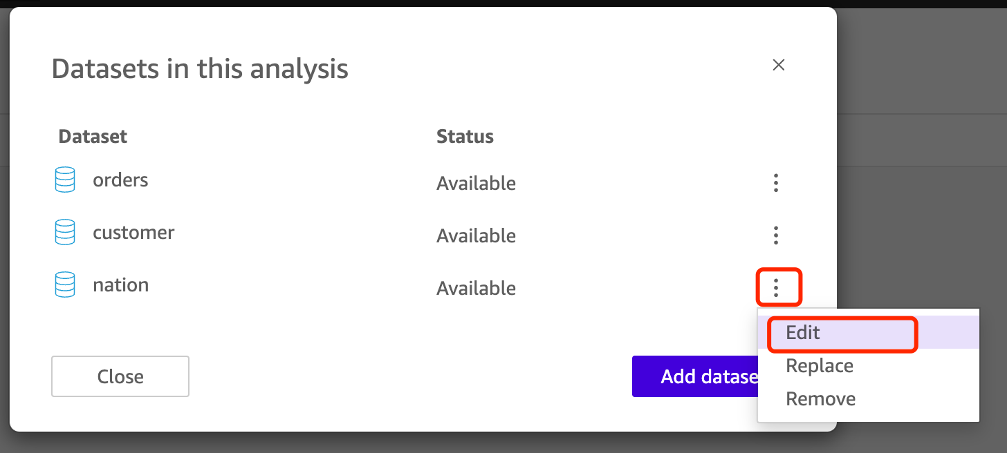 - 使用上述步骤创建的 Data source 添加以下表作为 Dataset