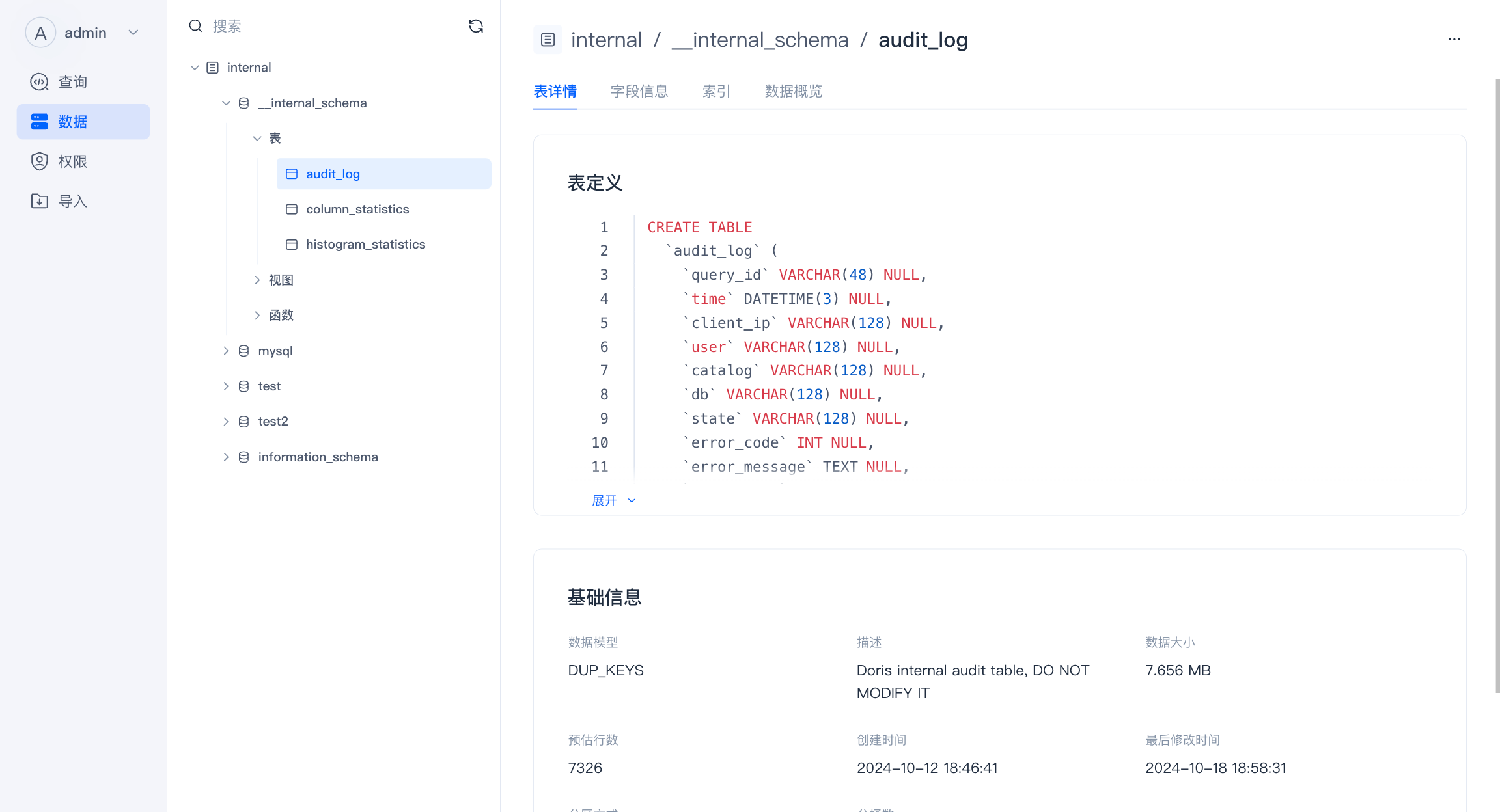 在表详情页面,你可以查看表的定义和一些基础属性。