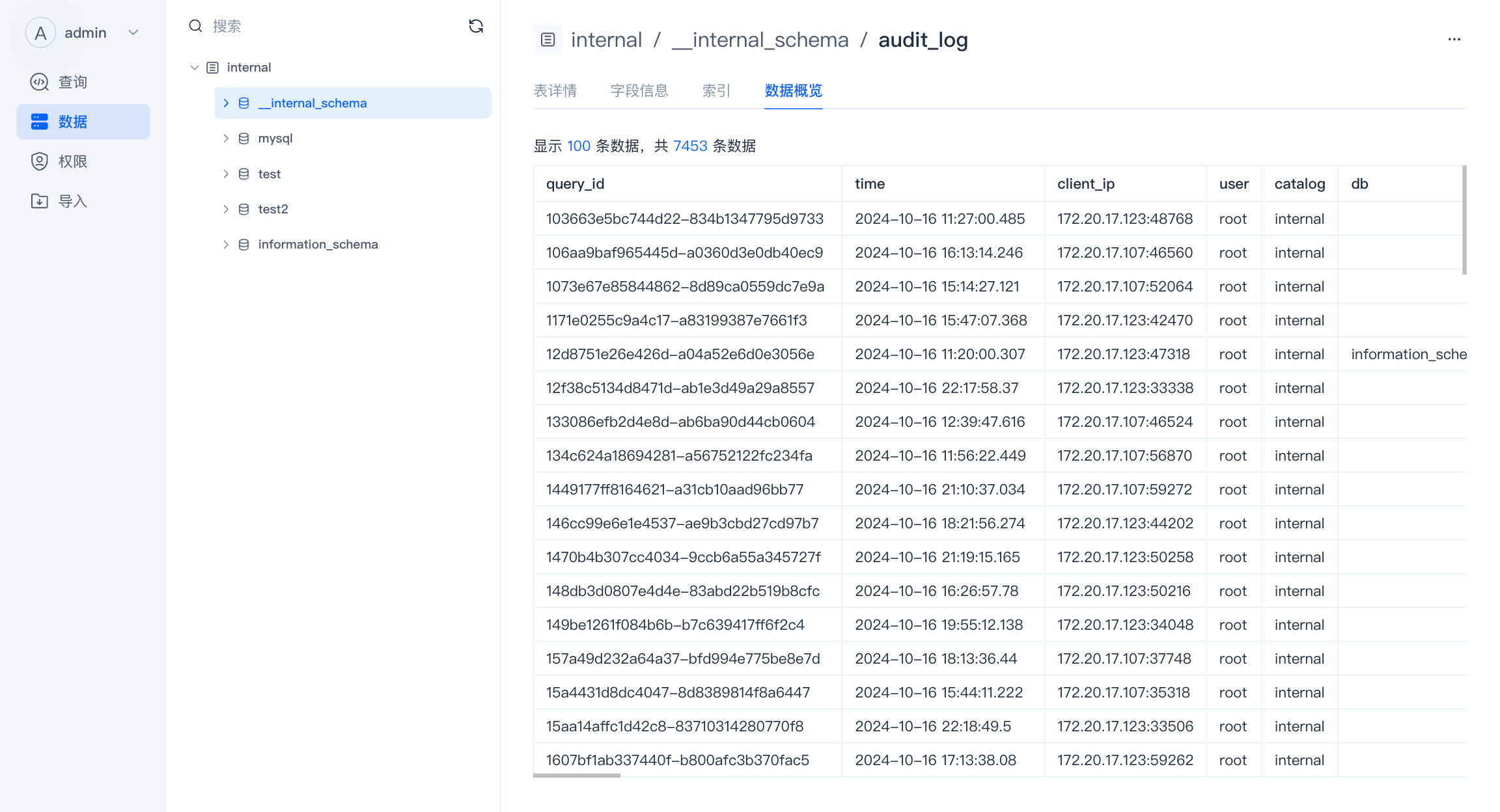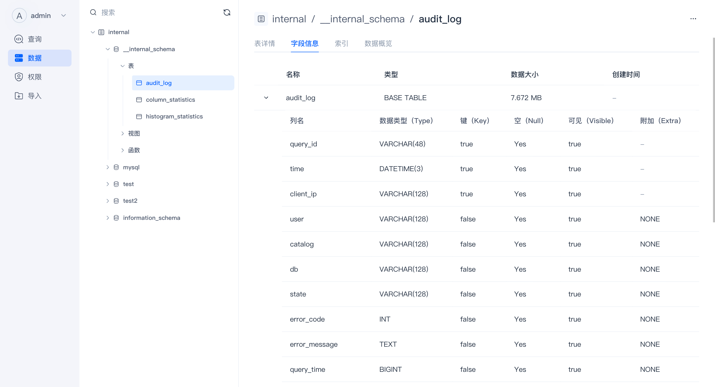 - 数据 :对数据库中数据的查看、编辑,当前支持查看。