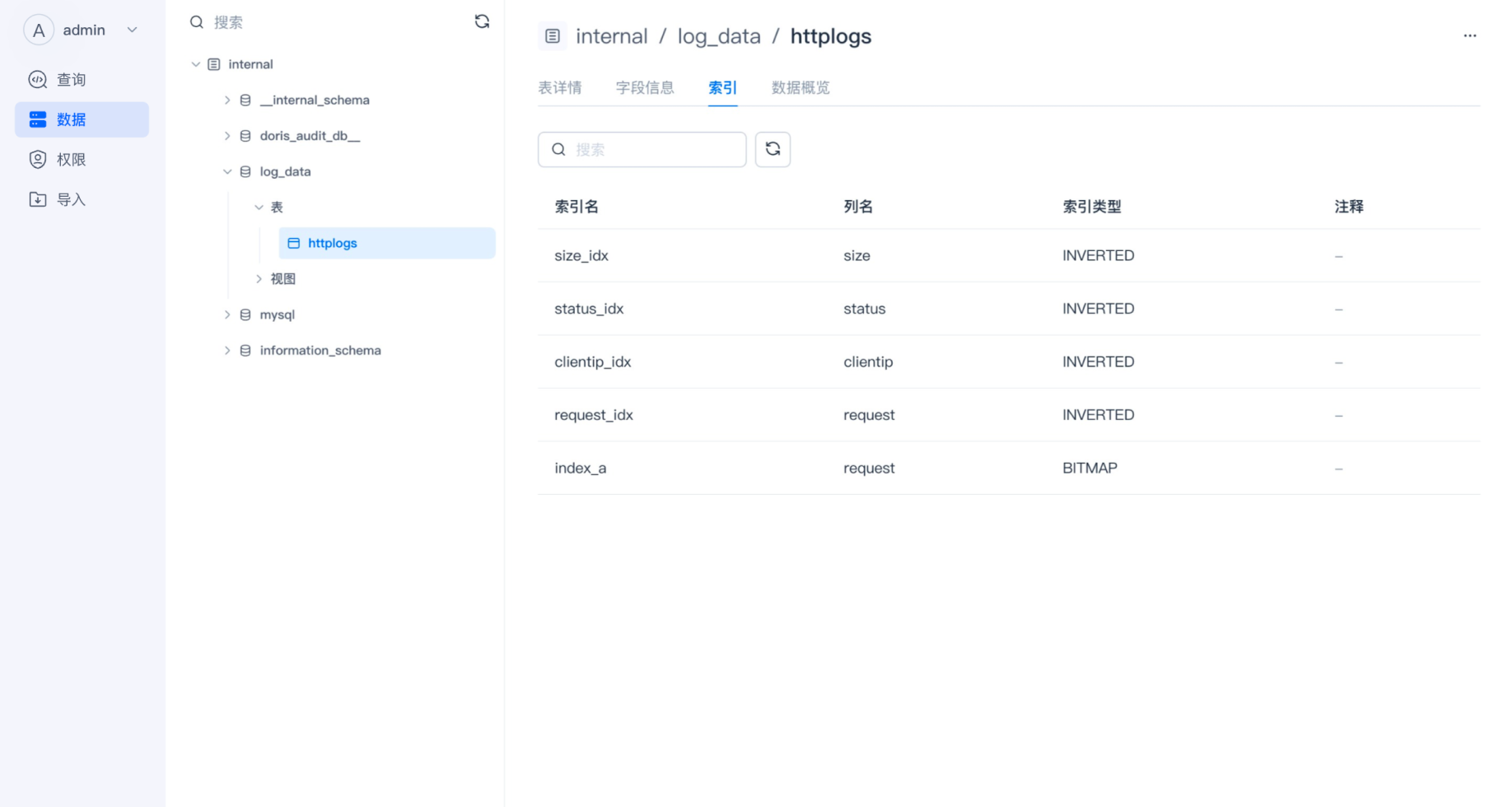 这里展示的是表内的索引信息,SelectDB Enterprise 中有很多类似索引的加速方式,在这里,分区、主键、Rollup暂时不作为索引对待,只展示 Zonemap、Bloomfilter、Bitmap/Inverted Index 这几类索引。