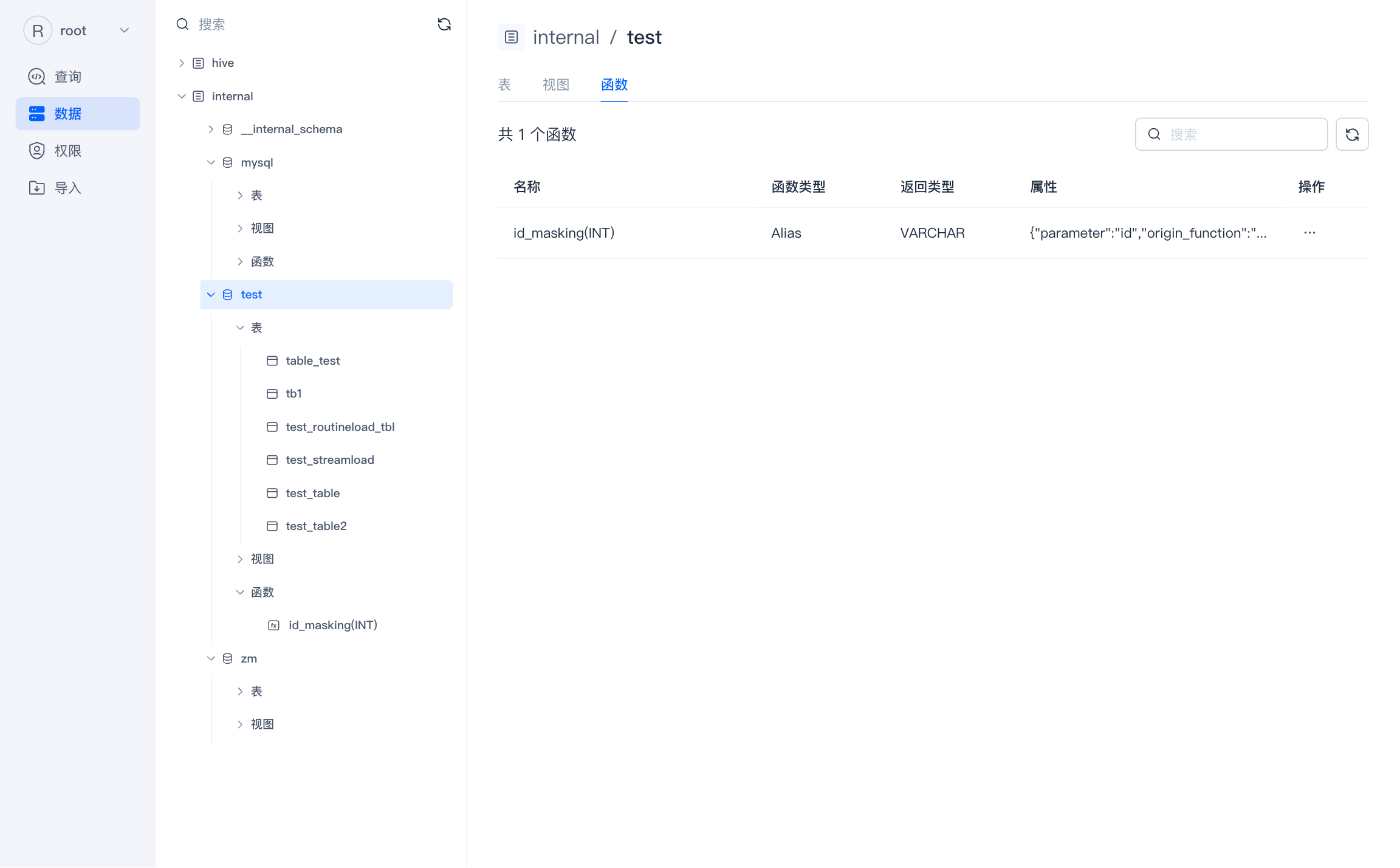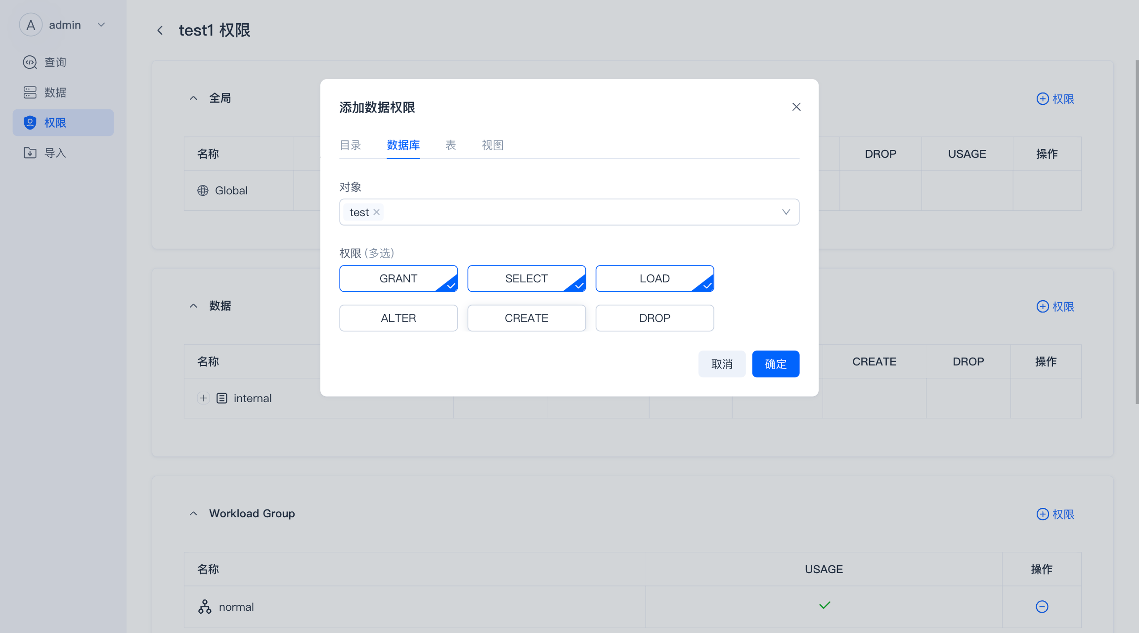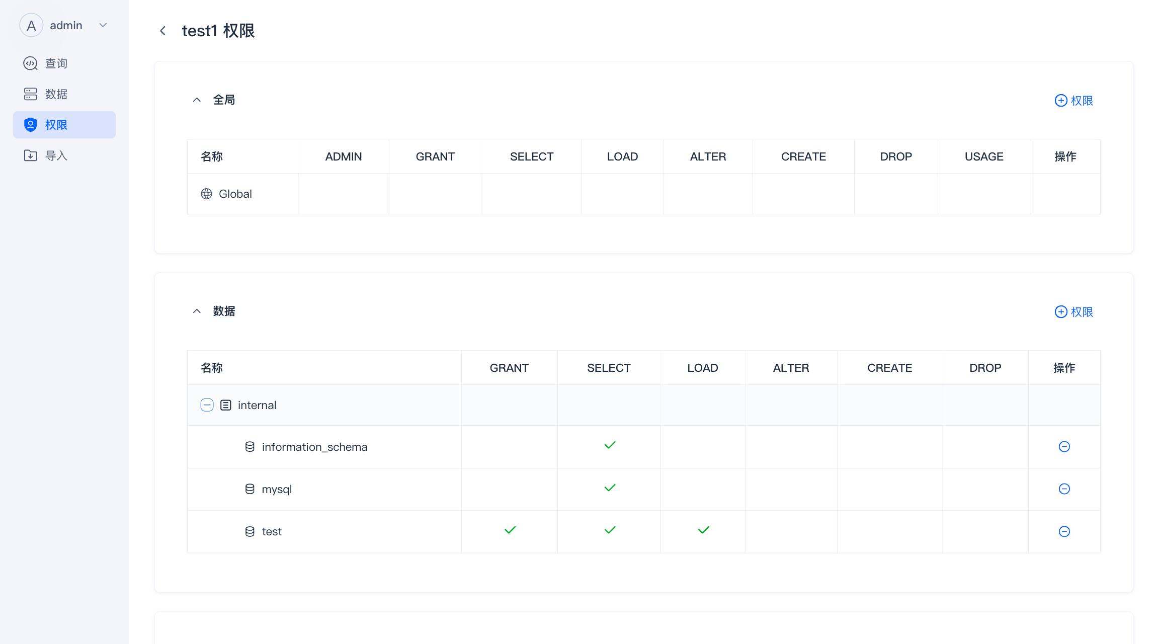 - 权限 :管理数据库内的用户和角色,并对其进行授予、撤销权限。