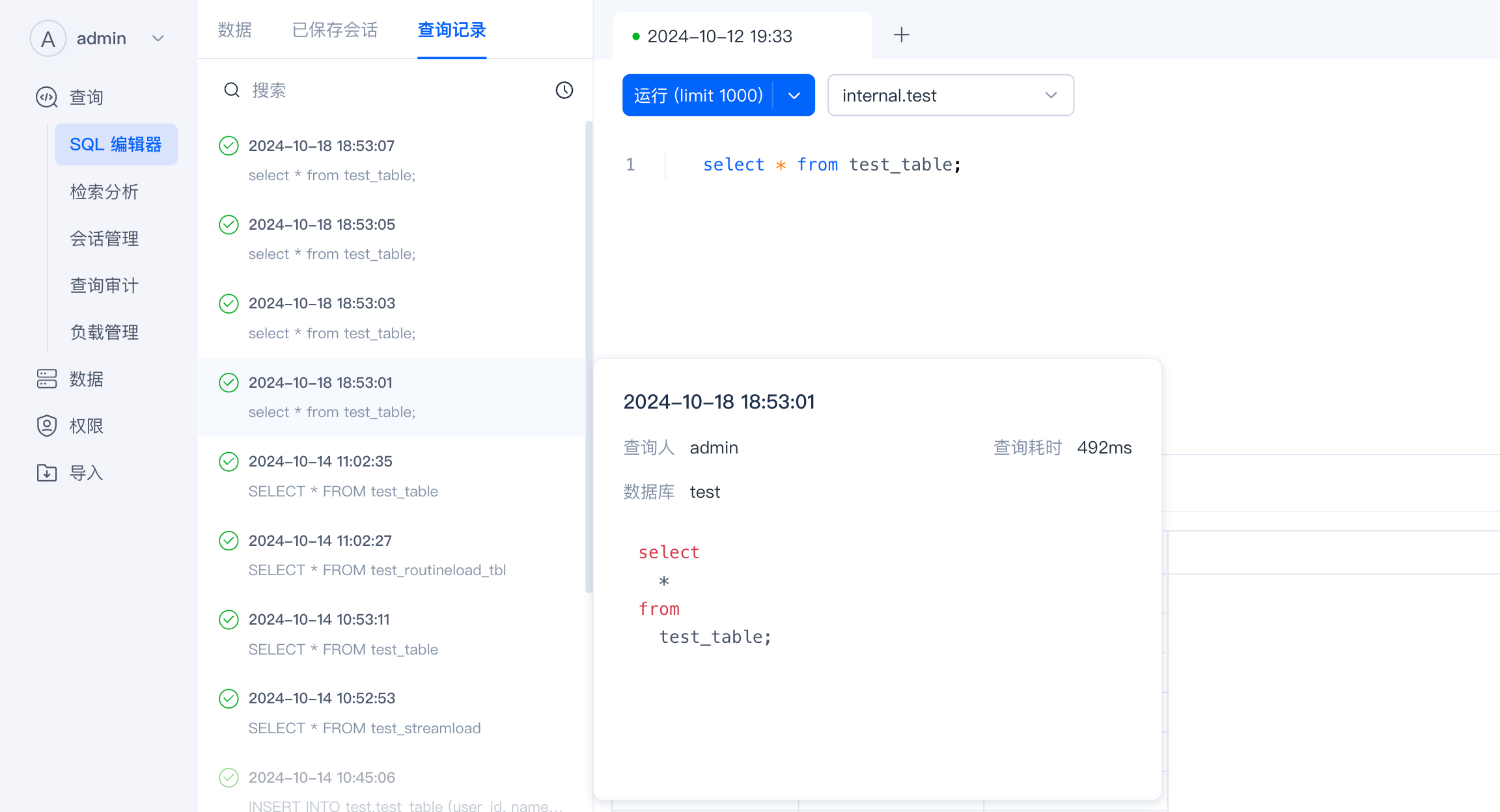 - SQL编辑器 :简单易用的 SQL 查询编辑器,支持查询执行、多 Tab、自动保存 SQL、查询 Profile、历史查询记录等能力。