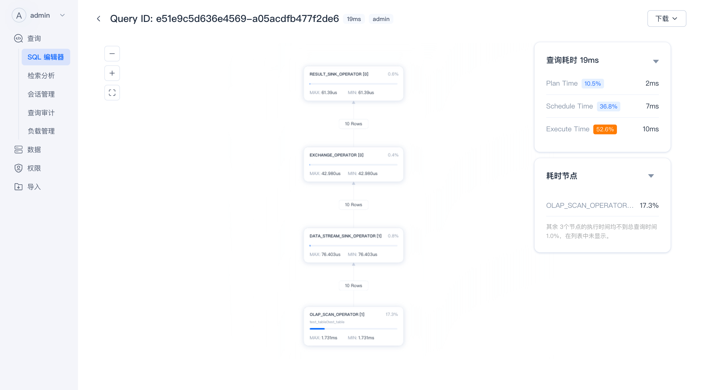 在 WebUI 发起的查询默认都开启了查询计划,这不会对单个查询性能造成影响,点击“查询语句”可以进入执行计划页面。
