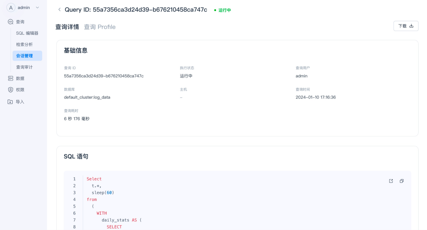 会话管理允许管理员用户管理资源的使用,并优先处理关键查询来提高系统性能,并提供有关每个会话的详细信息,例如执行时间、发起查询的用户以及正在使用的资源。