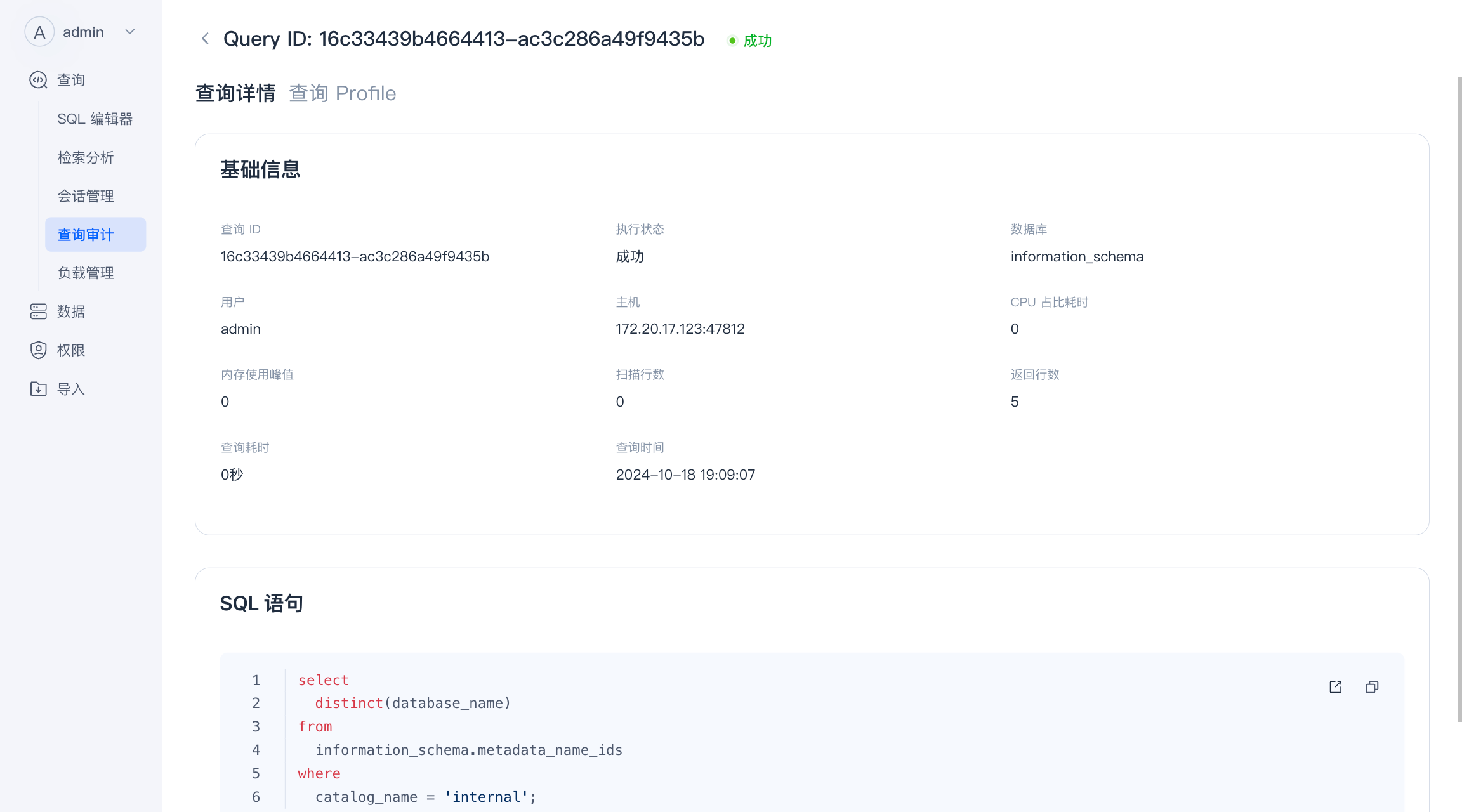 点击 “Query ID” 可以进入查询的详细页面,您可以查看更多的 Query 信息,如果开启了 Profile,您可以在这个页面查看查询的 Profile。