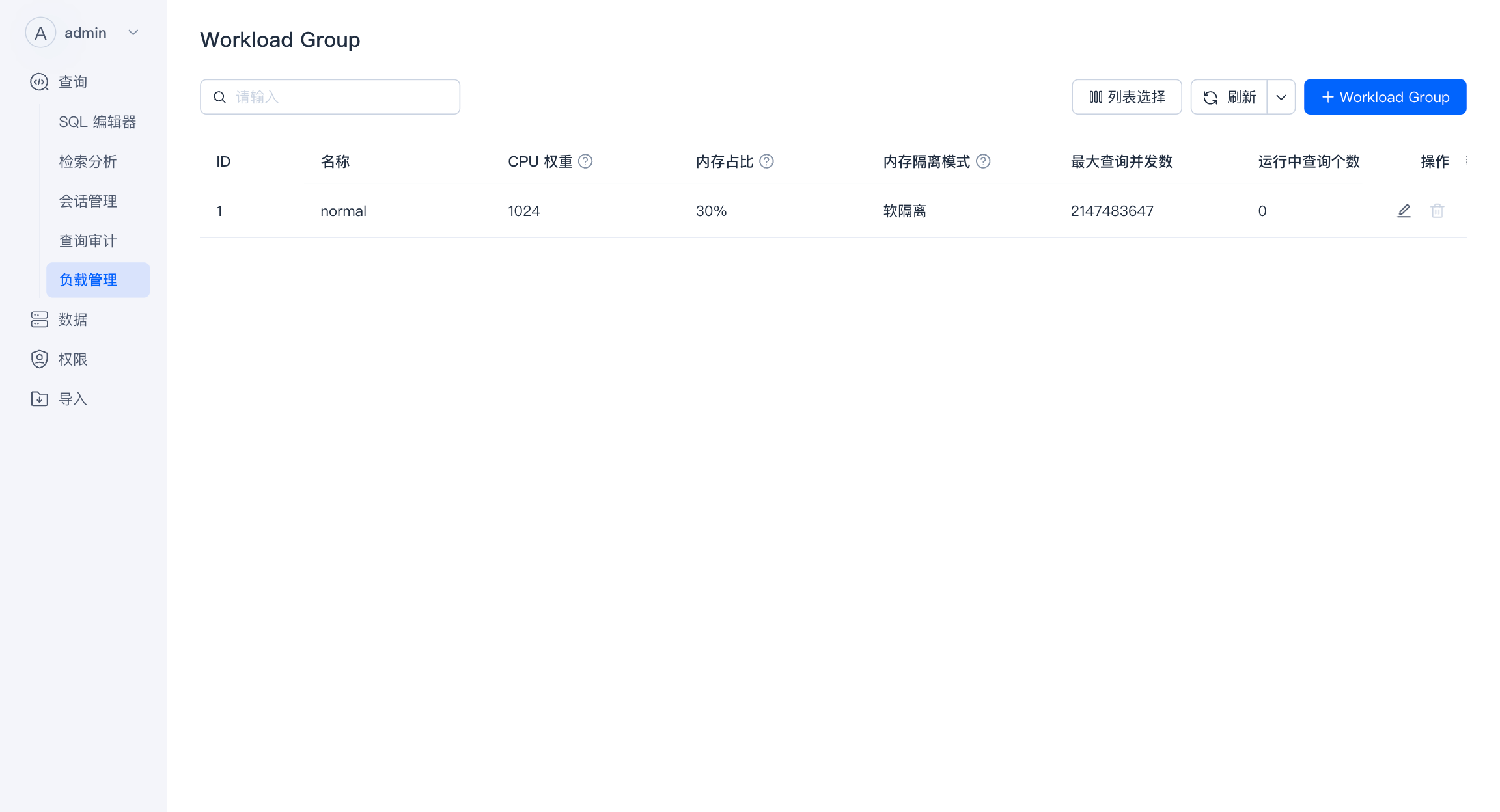 - 负载管理 :支持 Workload Group 的快速新建、编辑及查看。