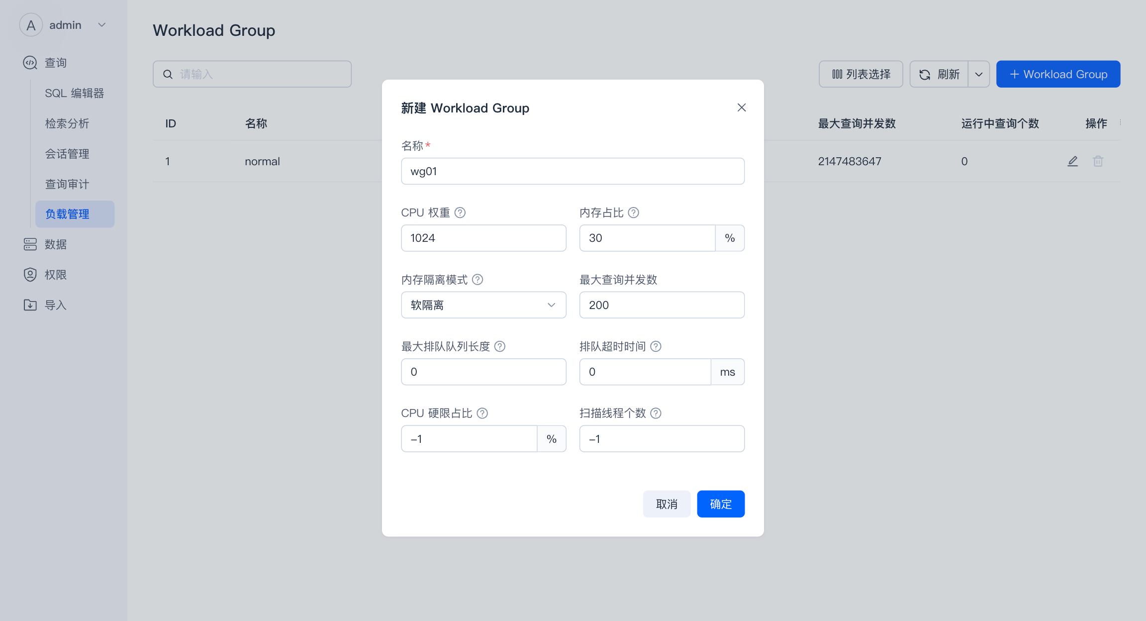 负载管理支持 Workload Group 的快速新建、编辑及查看,使用 Workload Group 可以管理集群中查询和导入负载所使用的 CPU/内存/IO 资源用量,控制集群中查询的最大并发。