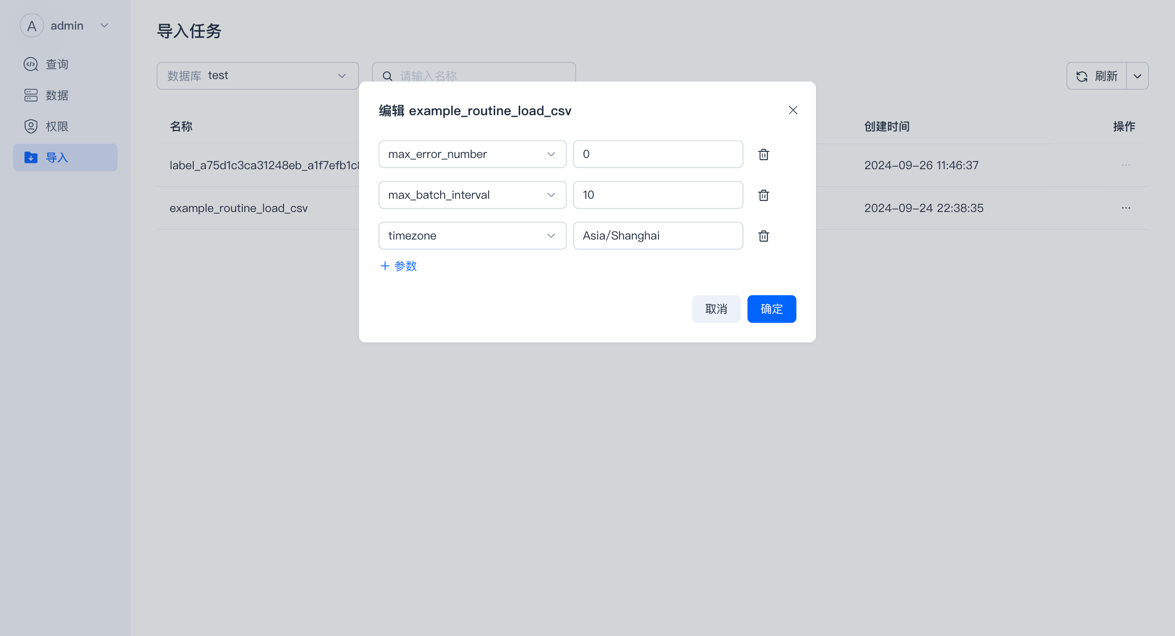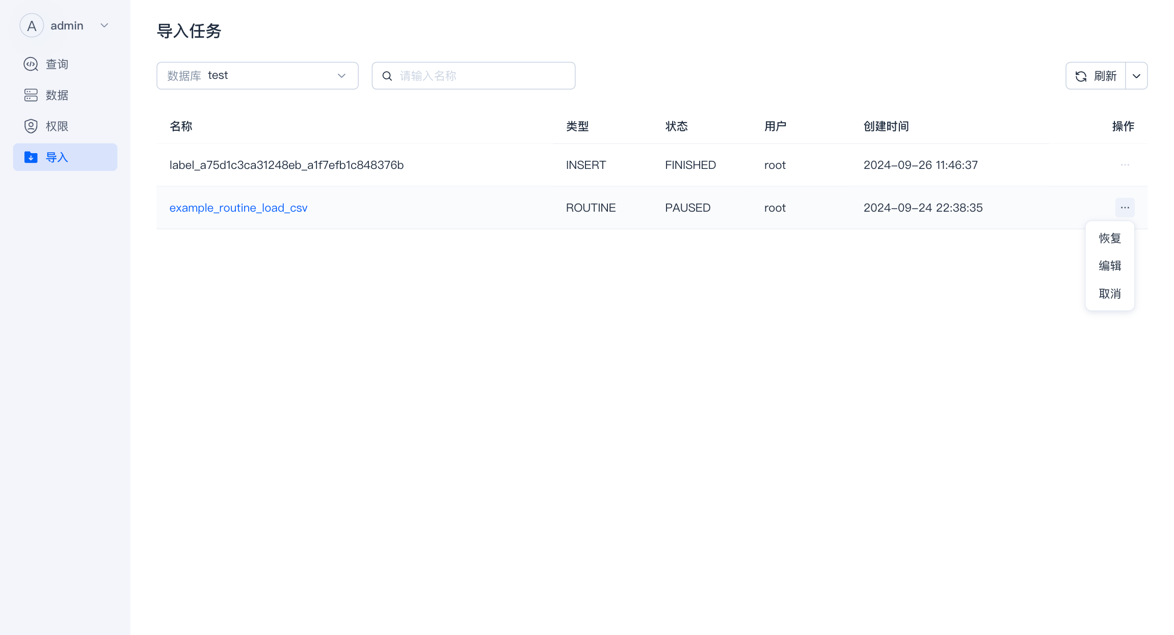 - 导入 : 支持导入任务的查看,并对导入任务进行操作。