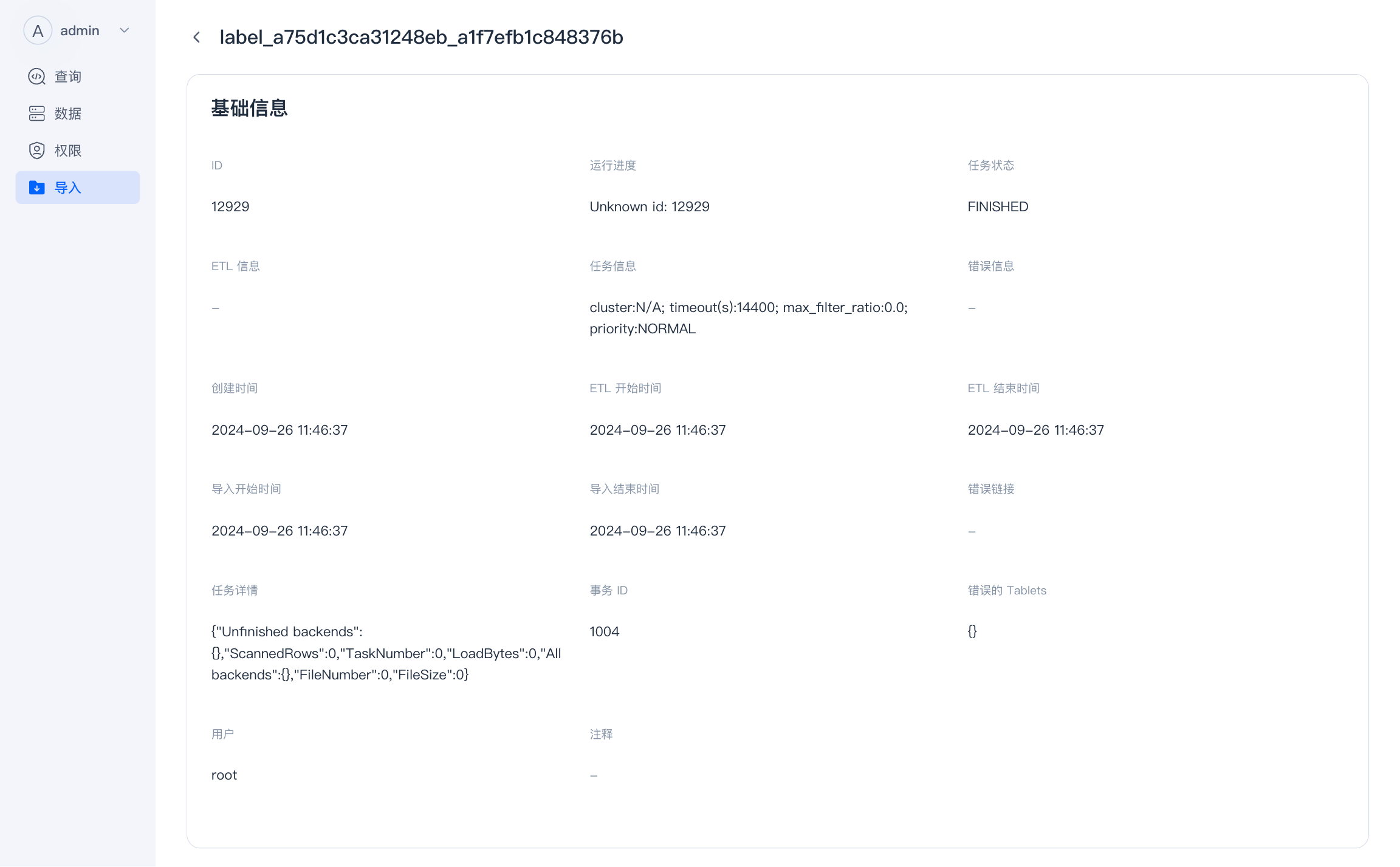 点击导入任务的名称 ,可以查看导入任务详情信息。