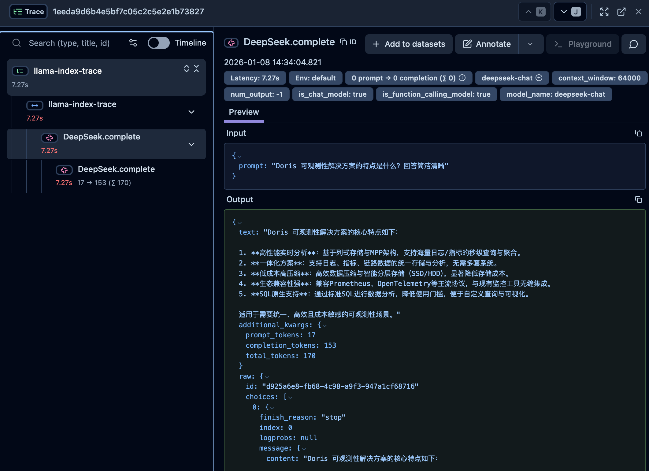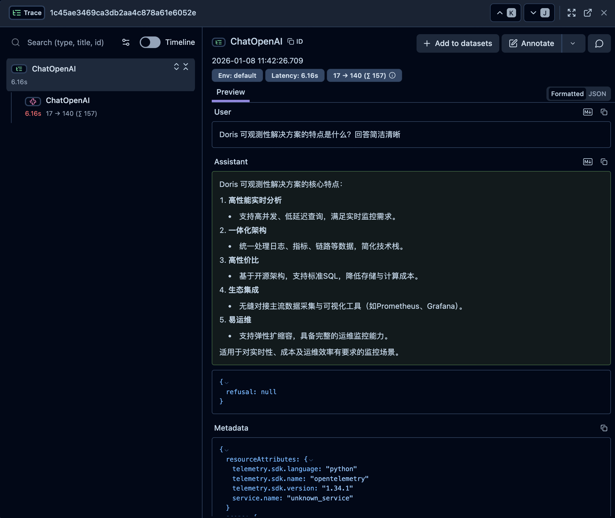 本文档将详细介绍如何部署基于 Apache Doris 作为分析后端的 Langfuse 解决方案,充分利用 Doris 强大的 OLAP 分析能力来处理大规模的 LLM 应用数据。
